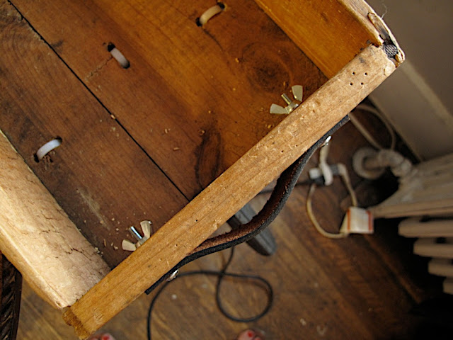 You'll need a bit of leather, a leather punch, two screws, two washers and two wing nuts. Determine how long you'll need it to be and how much you want it to pucker out. Drill holes in your box and punch them in the leather accordingly.